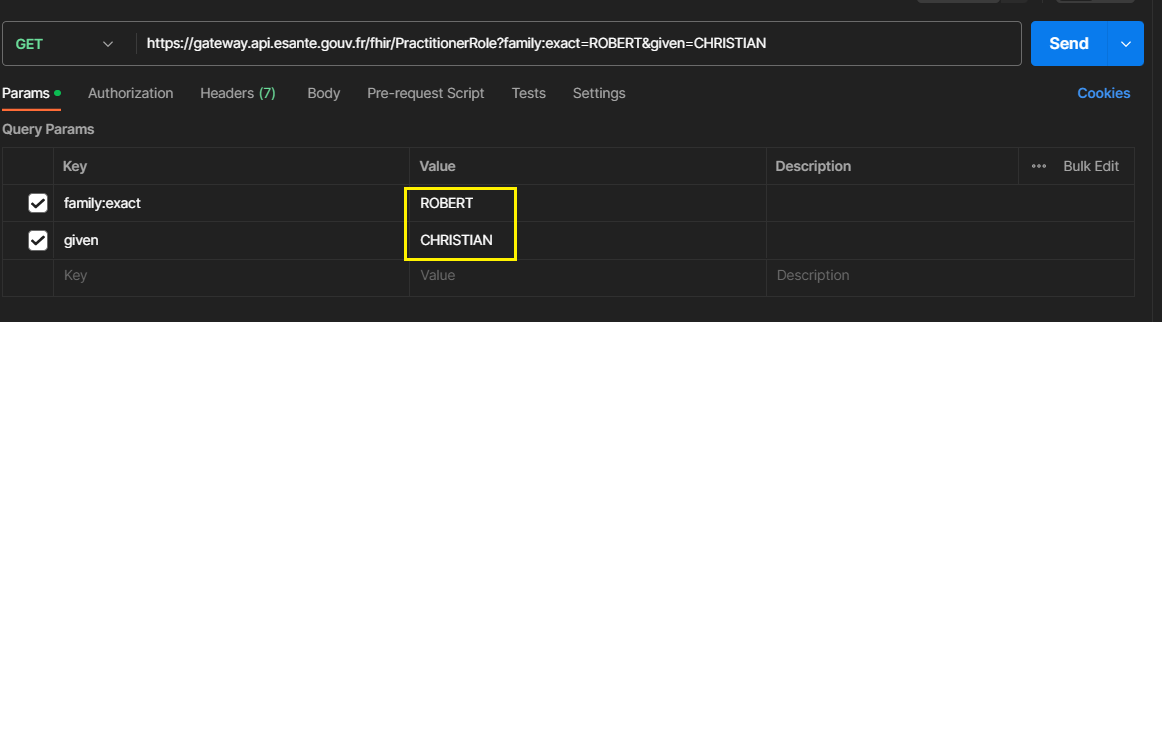 curl -H "ESANTE-API-KEY: XXXX-XXXX-XXXX-XXXXX" "https://gateway.api.esante.gouv.fr/fhir/PractitionerRole?family:exact=ROBERT&given=CHRISTIAN"