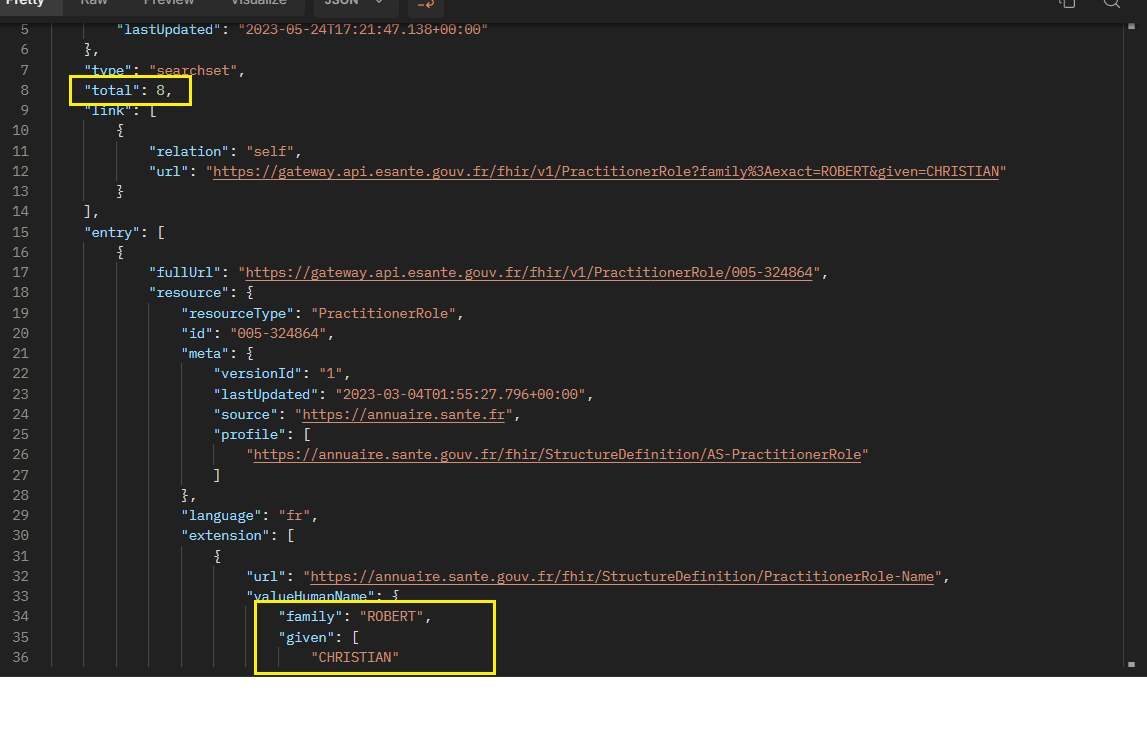 Le résultat retourné est un Bundle contenant l’ensemble des PractitionerRole (activités) remplissant les conditions à savoir : nom = “ROBERT” et prénom = “CHRISTIAN”.