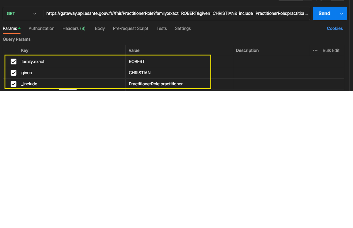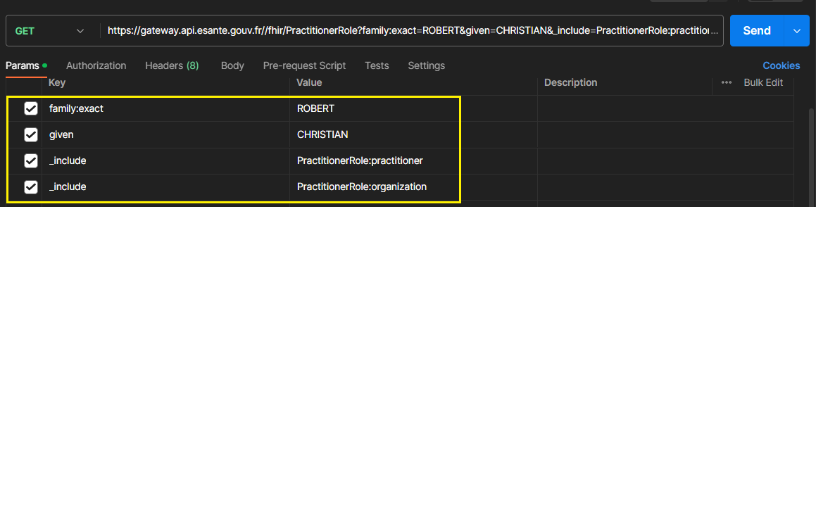 curl -H "ESANTE-API-KEY: XXXX-XXXX-XXXX-XXXXX" "https://gateway.api.esante.gouv.fr/fhir/PractitionerRole?family:exact=ROBERT&given=CHRISTIAN&_include=PractitionerRole:practitioner"