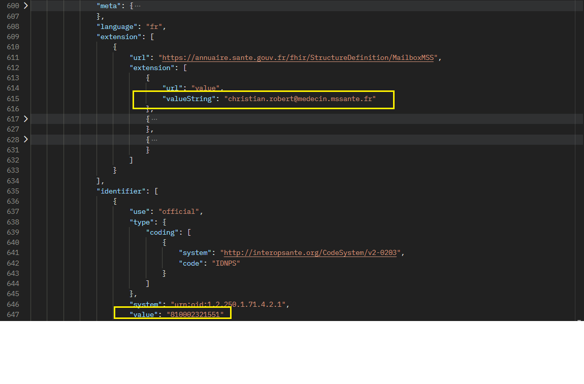 D’une part, le Practitioner sur lequel nous allons pouvoir récupérer le numéro rpps ainsi que le genre et les mailboxmss.