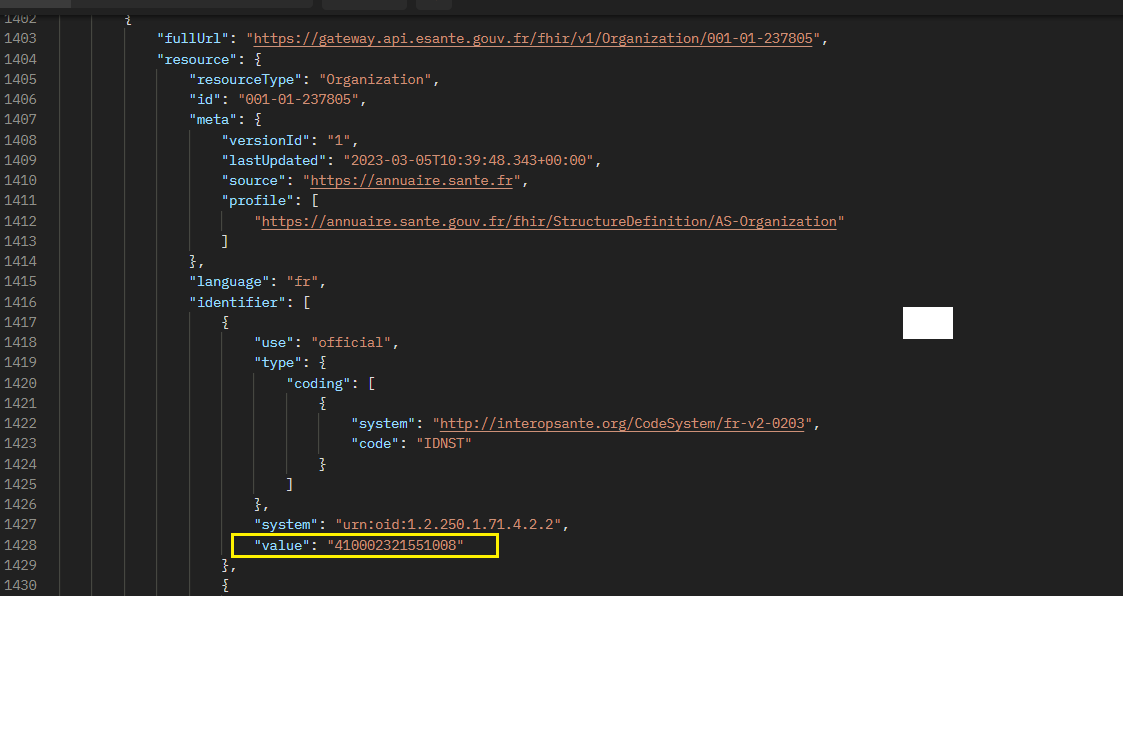 Dans la réponse de la première requête 1), on retrouve le lien vers la structure d’exercice : <”reference”: “Organization/001-01-519022”>. Cela permet de faire une requête vers l’endpoint Organization afin de récupérer la structure liée à cette activité.